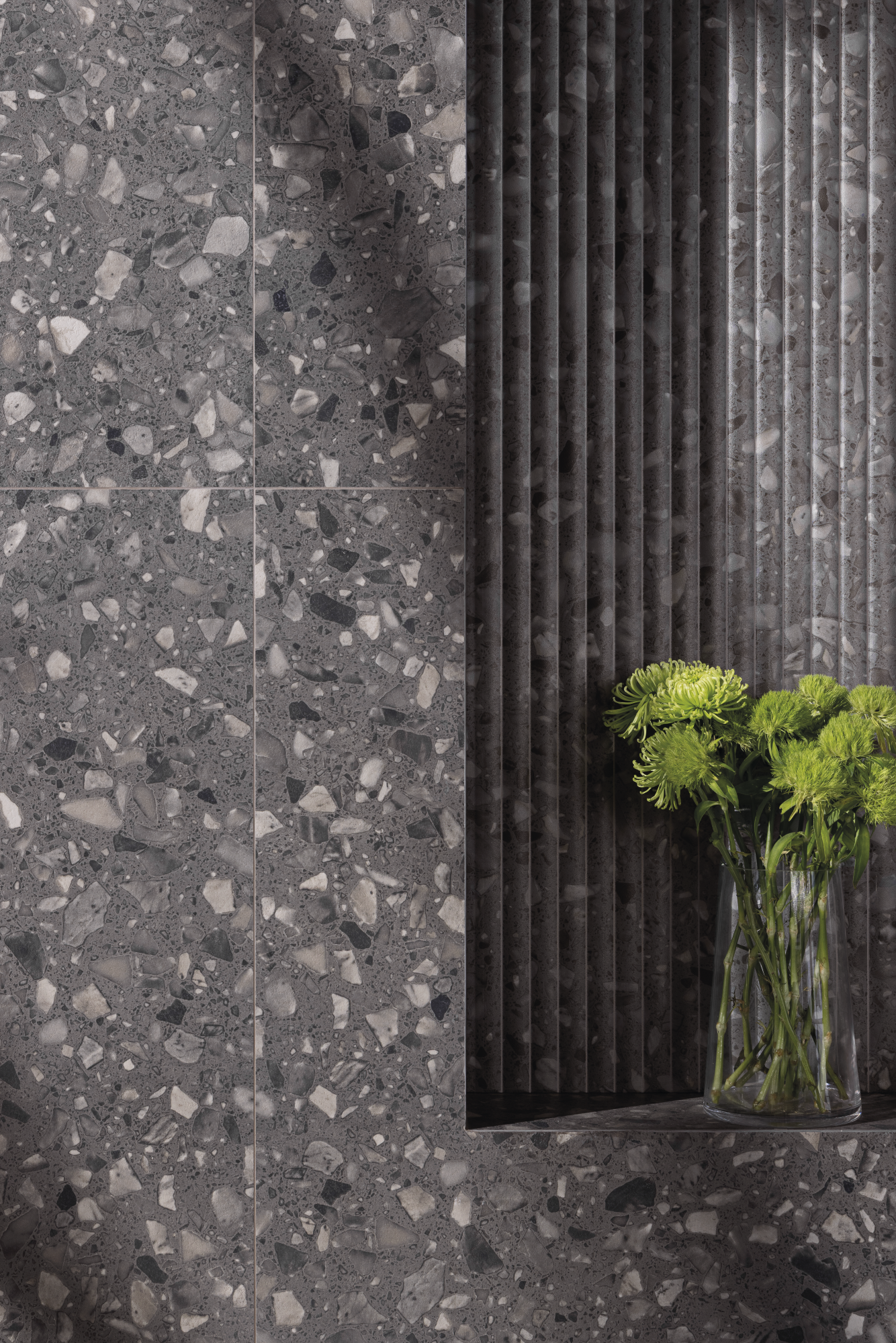 In large sizes or in 20x20 options, terrazzo comes to life in off-white, graphite and green, creating mosaics and new possibilities each time you look. Digital relief technology makes the stone emerge in a dance of textures that invites touch.